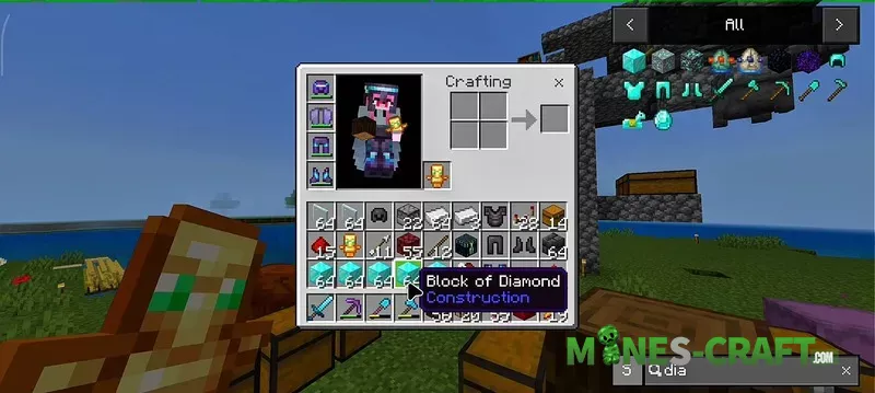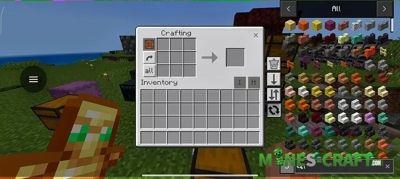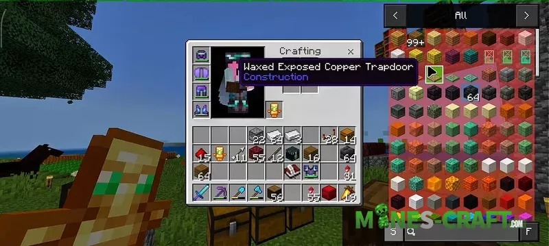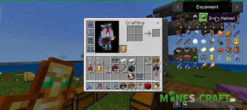 When Bedrock JEI is enabled, the recipe window is converted into a panel and the list of recipes will be right next to the inventory, just like in JEI on Java. This layout speeds up searching and reduces the number of taps when crafting. Plus, the pack itself is adapted to different interface scales (GUI scale), so the interface remains clear on both phones and pcs.