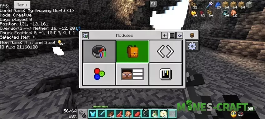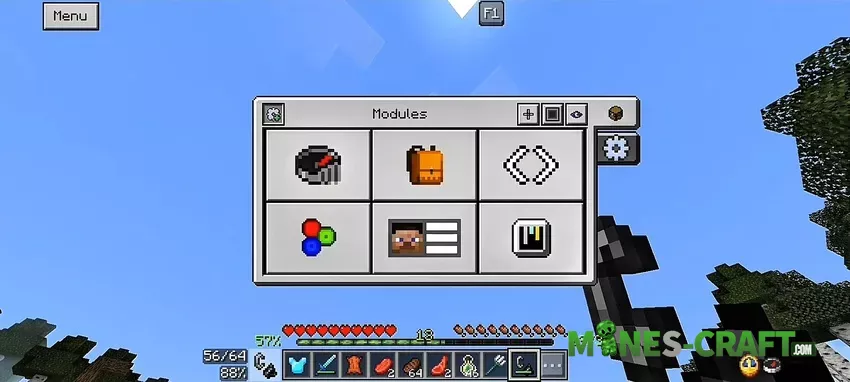 Open pause, then check the top-left menu. You can flip on a debug overlay, show your whole inventory without opening it, switch hotbar slots with arrows, or use an animated RGB XP bar. There’s even a gamma slider if you hate playing in the dark.