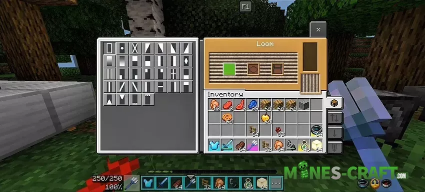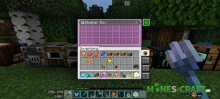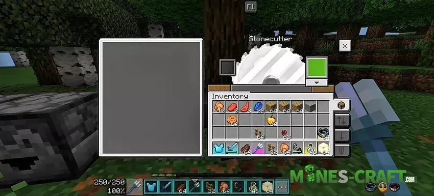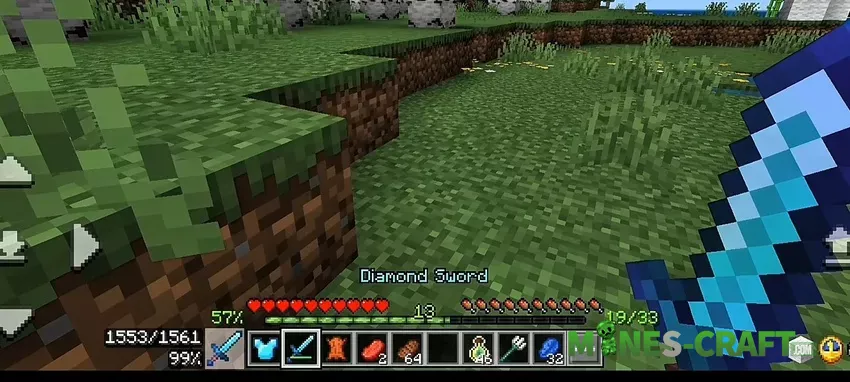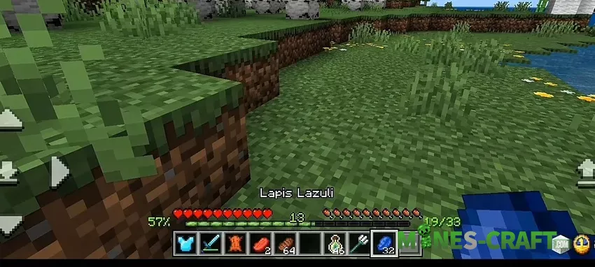 Tap the new F1 and the whole HUD disappears – perfect for screenshots. Tap again and it’s back. A working clock and compass live in the corner, while your XP bar shows exact percent and how much you still need for the next level. Numbers even match Java, which is a nice touch. The bottom chat looks like Java too, and you can see item durability with a warning when it gets low. That little detail saved me from breaking my diamond pick more than once.