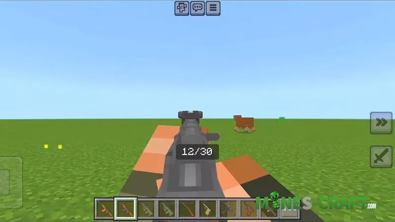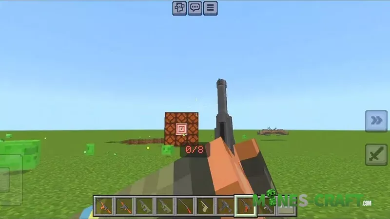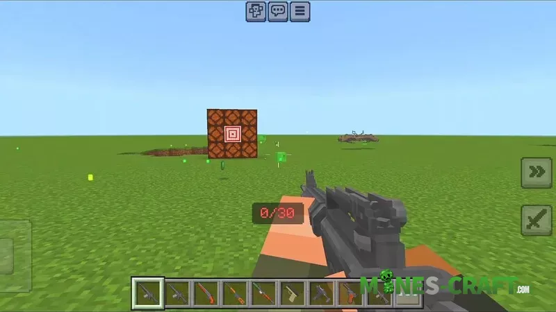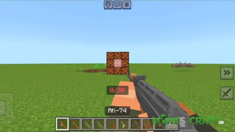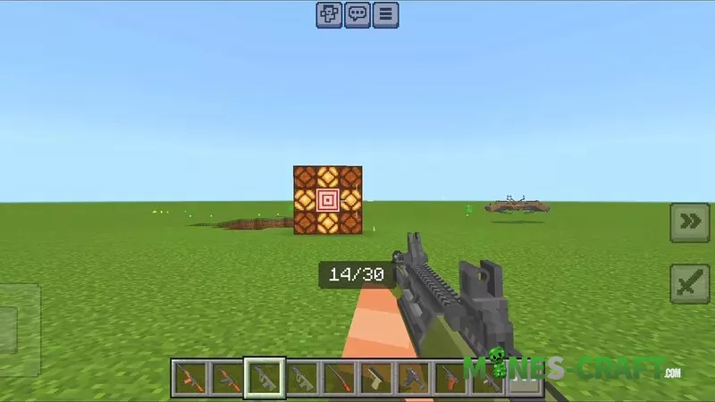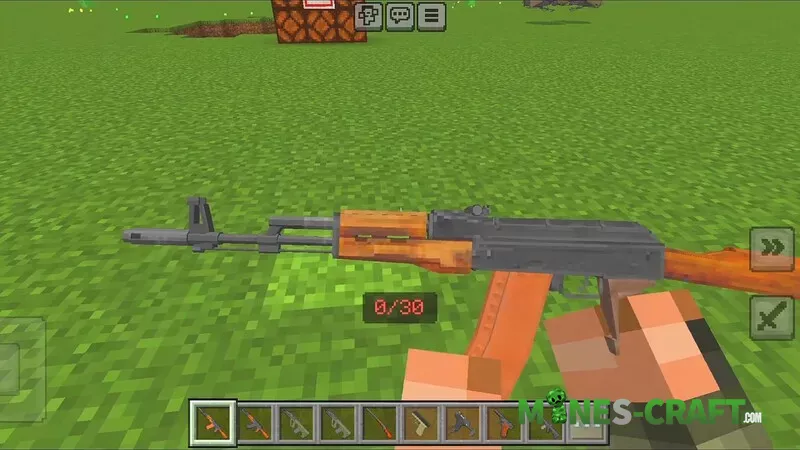 BlessedGuns 3D turns Minecraft Bedrock into a clean first-person shooter with real 3D gun models, functional iron sights, and a visible-to-read ammo counter. You see the 0/30 and 14/30 HUD, an ak with wooden furniture, and ADS at a redstone target. You earn guns by being traded with weapon shops thereafter you use optics as well as parts to upgrade them.