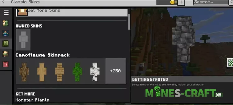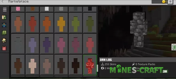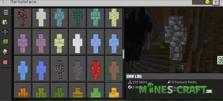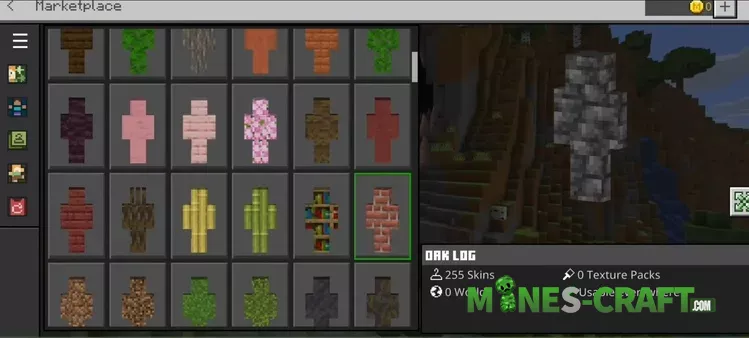 Start the process of using the Block Camouflage Skinpack by going into the Dressing Room, picking a match for your area and then joining your world. For oak forests choose Oak Log or Oak Leaves. In caves swap to Stone Andesite or Deepslate. On desert maps Sandstone and Red Sandstone work well.