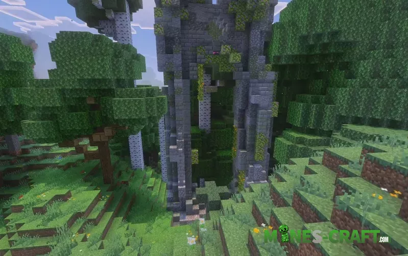 Bloomrock Pack BE overhauls the overworld with towering trees, fresh flowers, and new points of interest. It uses vanilla assets, so the game still feels like the original, only with richer detail and decoration.