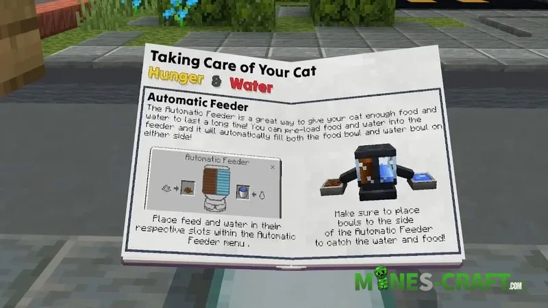 For convenience build a basic feeder using iron and iron nuggets. You can place raw fish in the food compartment and water in the water compartment. There is also an automatic feeder as a way to provide the cat with food and water for a long time. Load the resources and the feeder will automatically fill the bowls on either side dont worry about it too much.