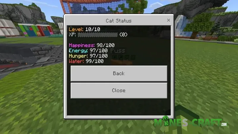 The menu displays energy, food, water, and whether the cat is happy or sad. If you tap on it you can view its level and experiance. In the CATS Add On, happiness, energy, hunger, and water levels are very important, and if the cat is acting up it may need food-for example fish cookies, which are crafted from cookies and fish (salmon, cod, or tropical fish)-this is just an example;