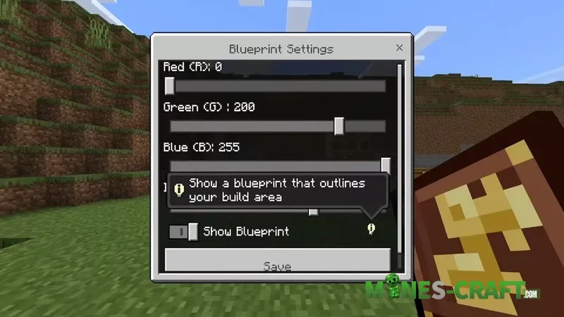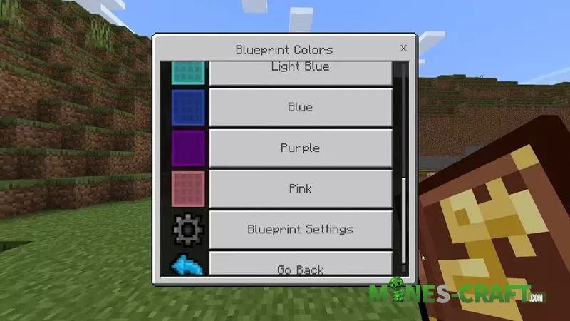 The manual contains an introduction and crafting recipes explaining the process. You can also change the colors of the blueprints: red, orange, yellow, lime, green, light blue, blue, purple, pink. In the blueprint settings, you can adjust the intensity of the colors.