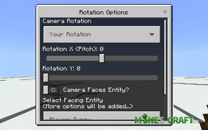 - Rotation Options (adjust X and Y or make the camera face a specific entity)