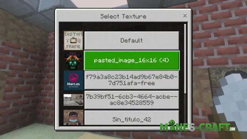 2. Brush (The Brush). Crafted from wool and sticks. This is the main control tool. If you click on a placed painting with the brush a selection window will open. Scroll through the list of your images (e.g., “pasted_image” or files with unique IDs) and view a preview right away.