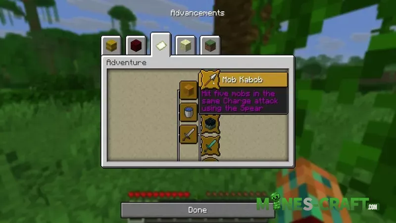 A new challenge called “Mobkebab” has been added. You need to hit five mobs with one spear strike. You can simplify the task by using armor stands, as they are also considered entities.