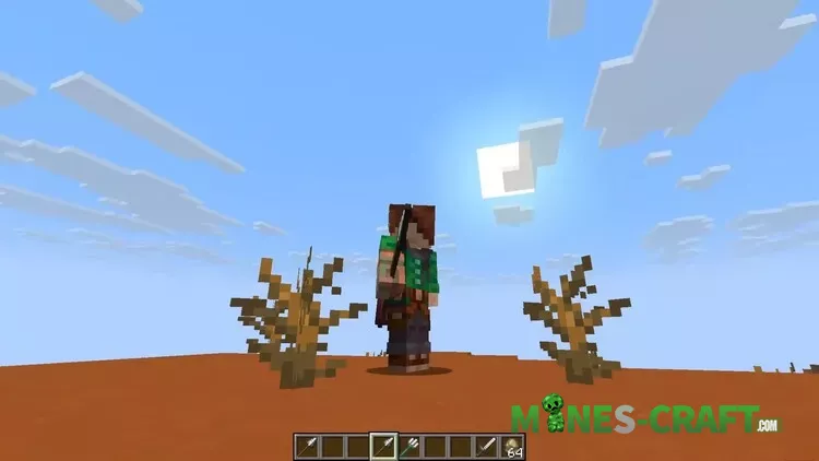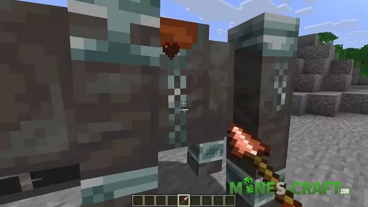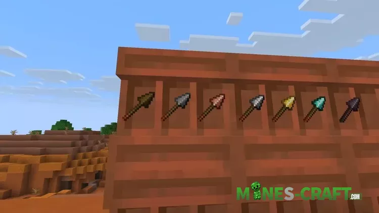 The next innovation of the Snapshot 25W41A is a spear, available from all standard materials: wood, stone, copper, iron, gold, diamonds, and netherite. It is crafted from two sticks and one material. The spear is visually larger than the trident and is used differently: the character holds it forward, and the attack looks like a stab.