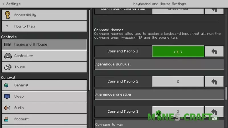 The main menu now features Realms and Marketplace buttons. But the most interesting changes are in the settings. In the Keyboard and Mouse section, command macros have been added to vanilla Minecraft Bedrock 26.0. You can assign up to 10 macros to any keys and bind commands to them. For example, Alt + 1 can instantly switch to Survival mode, and Alt + 2 can return to Creative mode.
