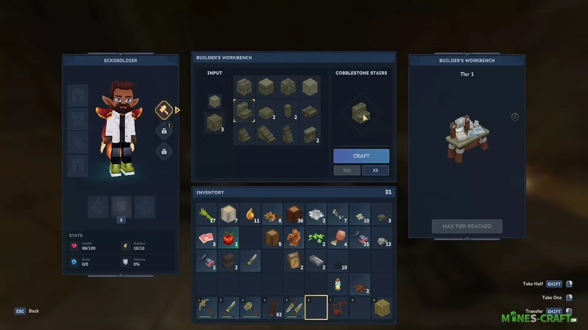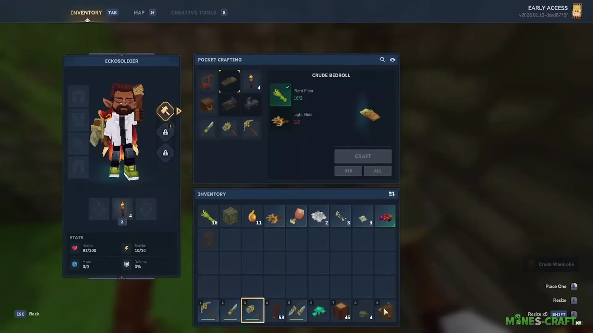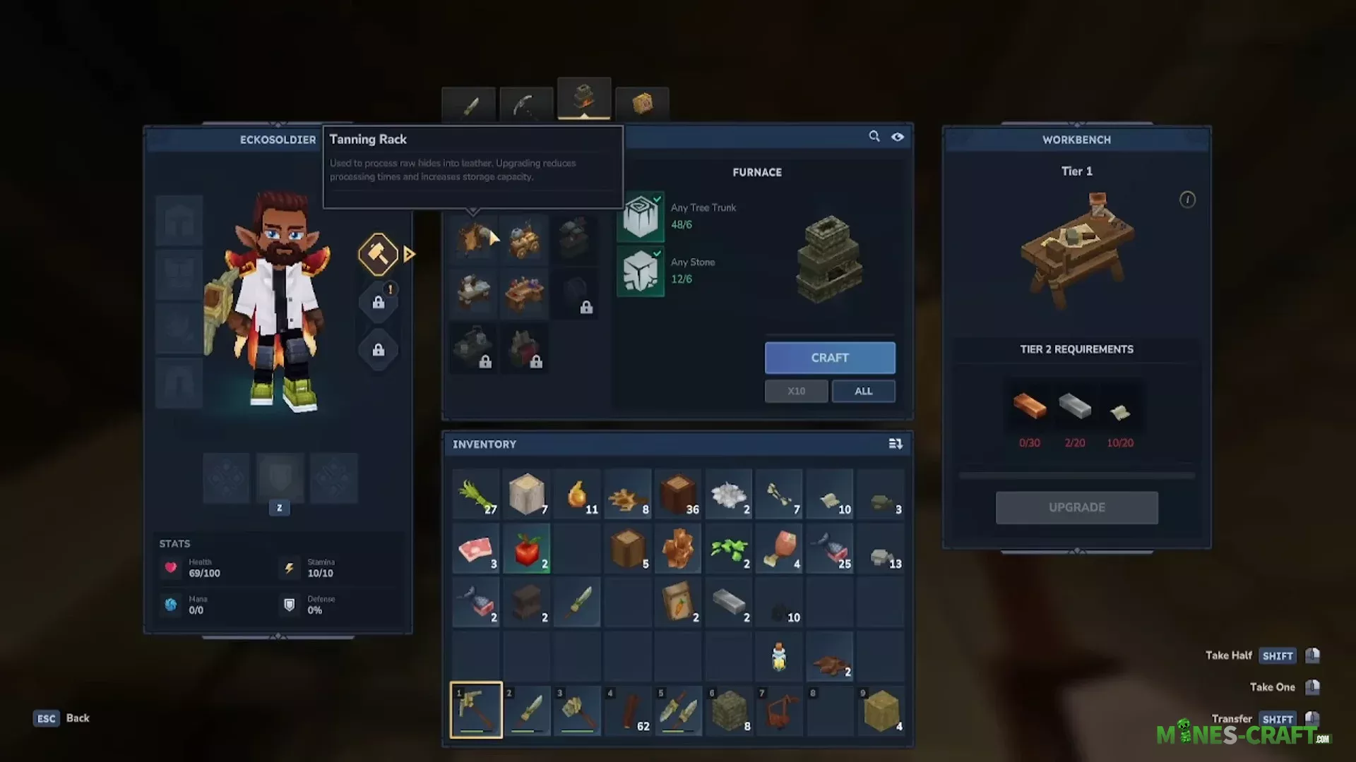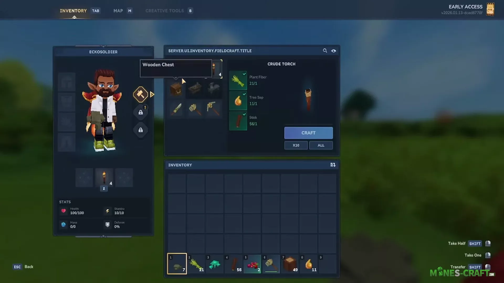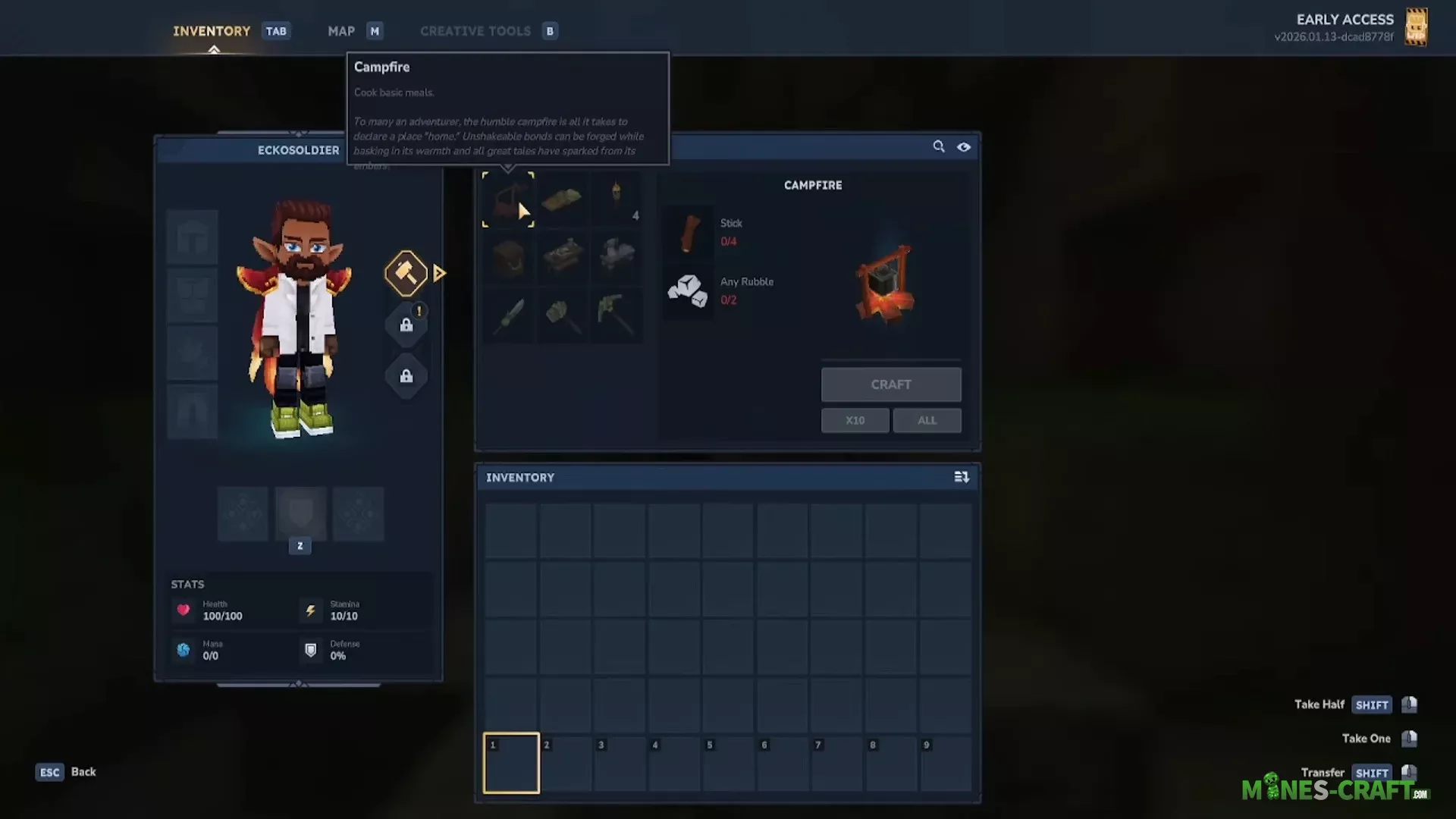 The interface is intuitive. The inventory, armor slots, and crafting system are familiar from other games in the genre but they have their own unique features. The first recipes include campfires, torches, chests, workbenches, and basic tools.