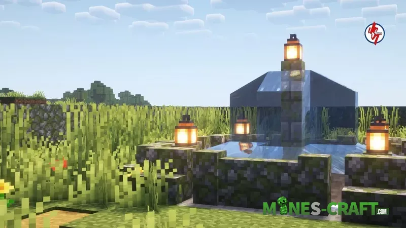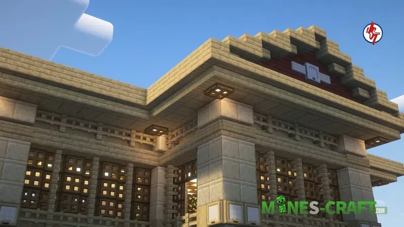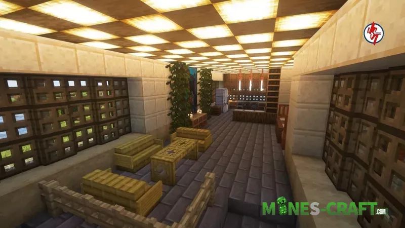 The ceiling is made entirely of glowing blocks (sea lanterns and glowstone) covered with trapdoors or slabs to get that sort of lattice-lamp look, so it stays bright inside almost all the time. Then there’s a large living room with soft zoning, yellow couches and wooden tables (birch and yellow sandstone). The floor is dark smooth stone, just take a look at the screenshots.