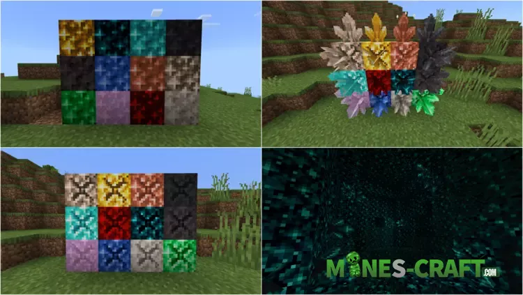 The crystal blocks come in 12 clean colors, great for trims, floor inlays, and portal frames. Mix blackstone or deepslate with teal or red crystals for strong contrast. Bring Silk Touch and Fortune. Light caves to spot color fast. In the Nether, hunt quartz and netherite geodes near long tunnel walls to expose large chambers.