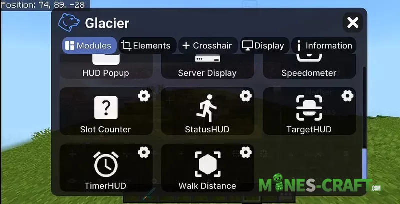 The main feature of Glacier Client is the convenient draggable GUI, which lets you move all HUD elements on the screen how you like so you can customize everything your way. Unlike other clients for PEMinecraft, this one really gives you the ability to fine-tune the UI.