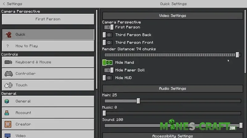 A Quick Settings section was added to the settings. You can also change the maximum FPS directly from the interface. There is touch control support for Nintendo Switch and a button to switch perspectives (first/third person) without entering the settings.