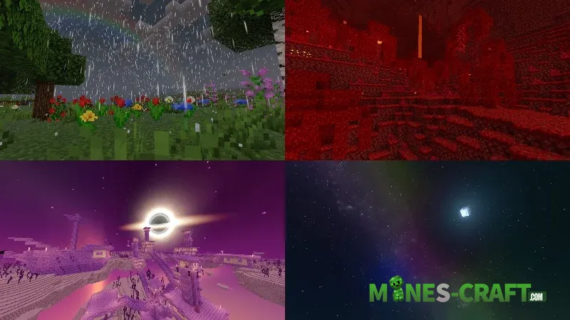 The shader adds vibrancy, but the main focus is on liquids and caves. Lava appears as a thick mass with smooth flow animations, and minerals have a self-luminous effect. In the Edge dimension, daniswastaken added somthing similar to Singularity. Instead of the usual sky, there is now a huge black hole.