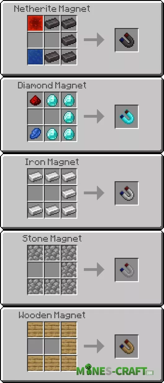Each magnet differs not only in material but also in the radius of attraction. The higher the level, the further it collects items. For example, a wooden magnet works within a radius of 4 blocks, a stone magnet – 6 blocks, an iron magnet – 8 blocks, a diamond magnet – 12 blocks, netherite magnet 16 blocks.