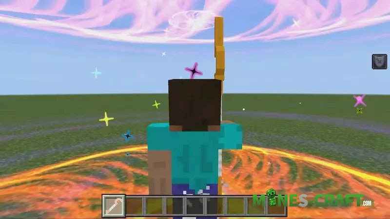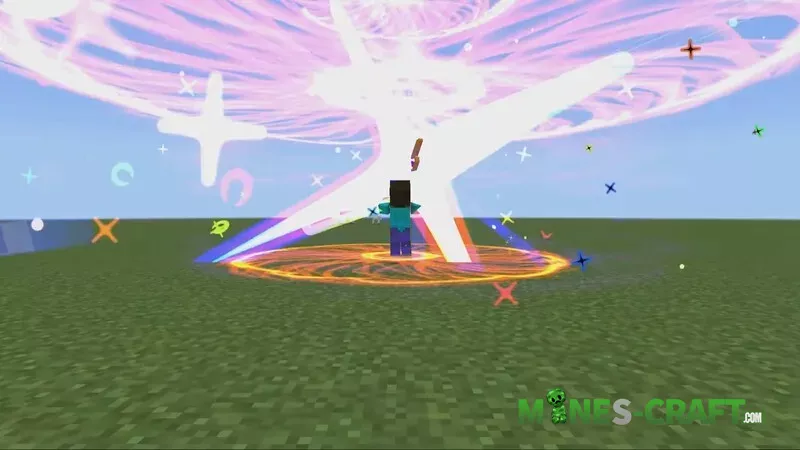 Activate the staff and the sky will light up with dazzling flashes, spirals of light, and rainbow streams of energy. But there’s more to it than just the visuals. Each use of the staff turns into a spectacular show: circles of runes under your feet, bright energy beams, and a powerful wave of light. One tap causes a huge energy explosion, leaving behind a crater comparable to a pile of TNT detonated.
