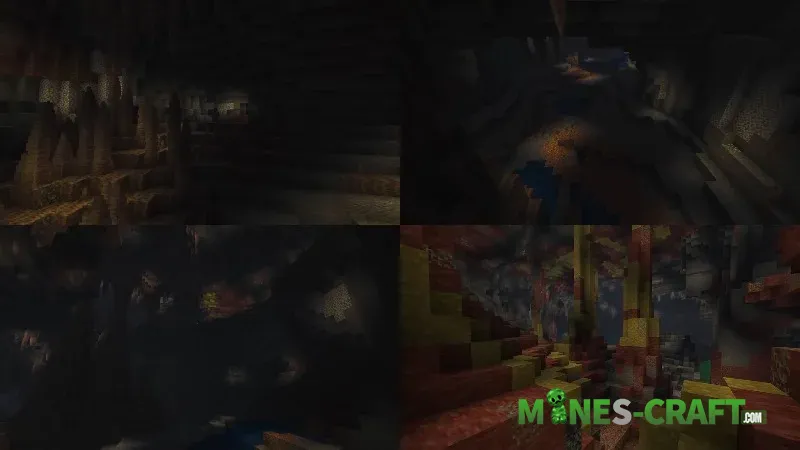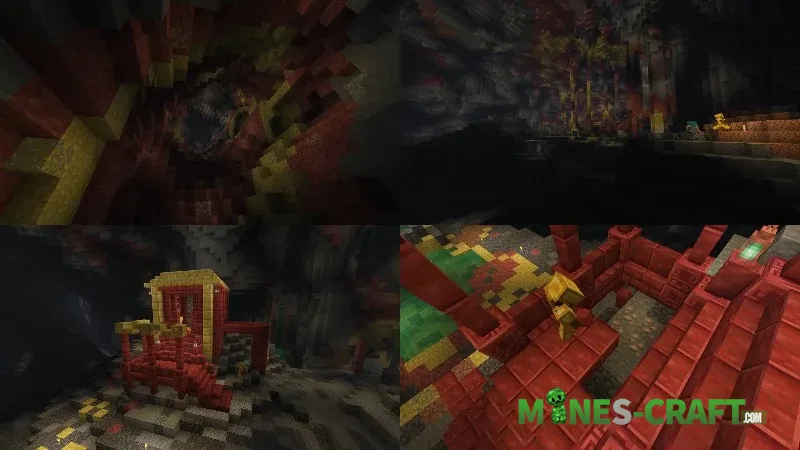 The Chaos Cubed update begins with a new biome. Sulfur Caves now generate at the deep shale level, and their toxic yellow and blood red hues make them unmistakable.