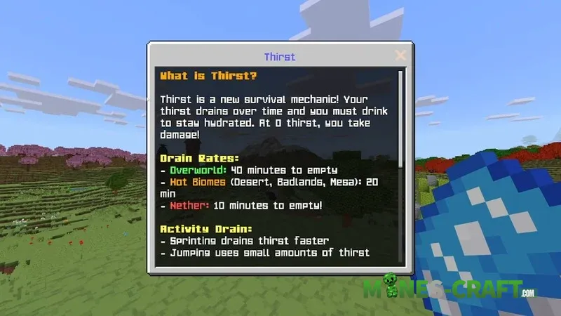 - A survival system with a thirst meter that depends on the biome and the players activity.