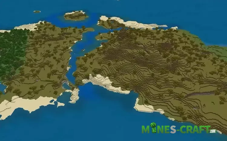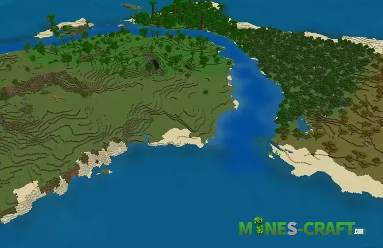 A continent-size island split by rivers. The west holds wide savannah. The center mixes birch and oak with jungle bands. One edge shifts into sparse jungle and plains. It’s perfect for a long world: beaches for ports, cliffs for bases, flat fields for farms. Below, you hit a huge water cave, a massive dry cave, Trial Chambers, and a Stronghold. Build above, raid below, then link every shore with bridges.