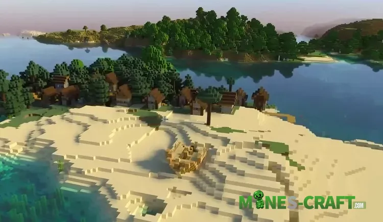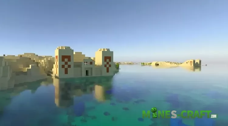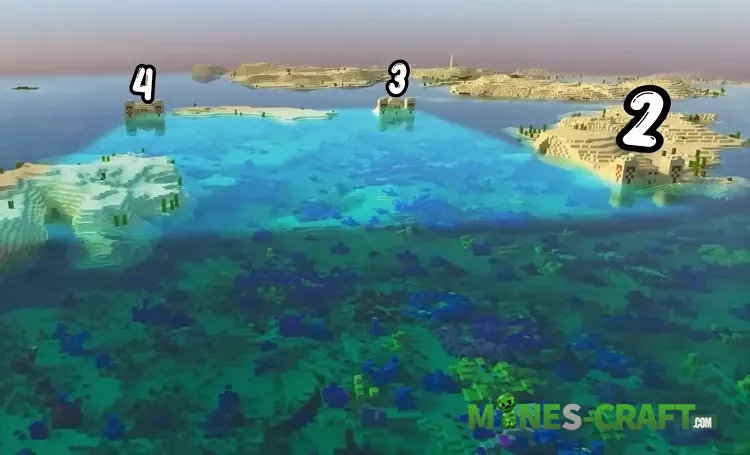 You spawn facing four desert temples sitting in shallow sea, arranged like a neat square. Clear the TNT, then sweep all four for instant gear: books, diamonds, gold, and more. Nearby surface structures extend the loot run, so early tools, food, and trade stock come fast.
