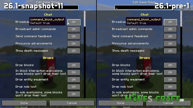 New background in the main menu-the Panorama in 26.1 Pre-release 1 now matches the Tiny Takeover theme. Interface changes: for example if the servers difficulty changes while you have the world settings open, the data will update instanly. We’ve also fixed the display of player names above players so they’re now visible through blocks again and items behind name tags are displayed correctly without transparency bugs.