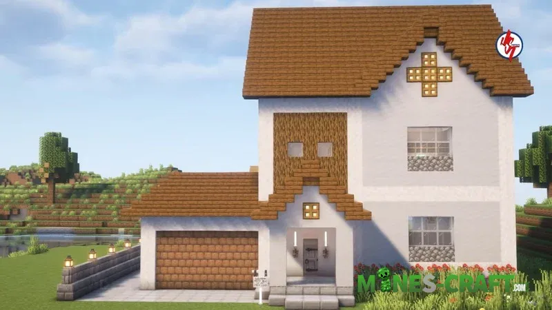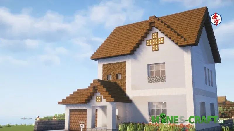 An island biome was chosen. The house is located right by the water, and there’s a village nearby. Externally, the building has white walls, and the facade features an unusual cross-shaped window. The house has elements that distinguish it from other houses in Minecraft: PE.