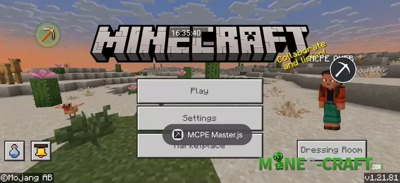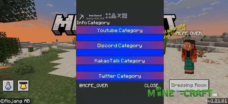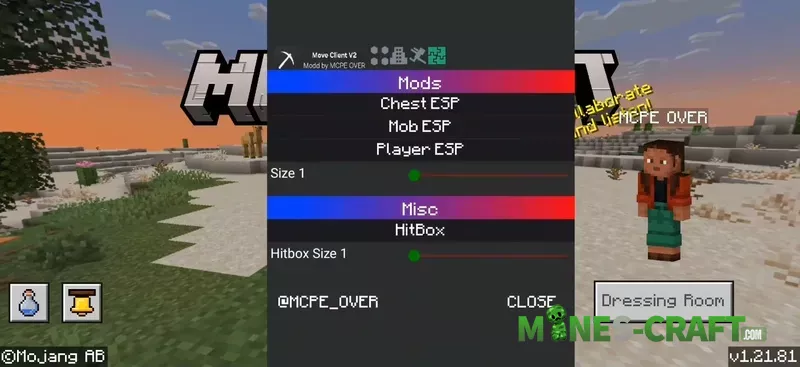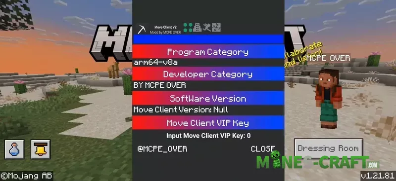 Move Client is an Android APK client for Bedrock with built-in mods and a ModPE script manager. It adds a quick menu on the title screen, so you can toggle features without loading a world. The client includes “Player,” “Mods,” and “Misc” tabs, plus a small pickaxe button to open the overlay.