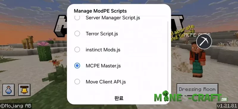 - Script loader: choose any .js script (for example, “MCPE Master.js” or “Move Client API.js”).