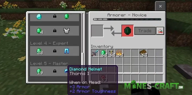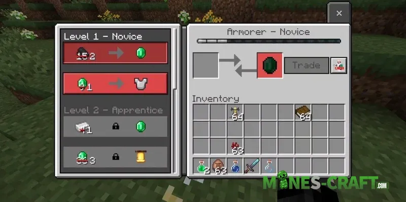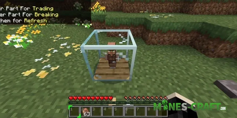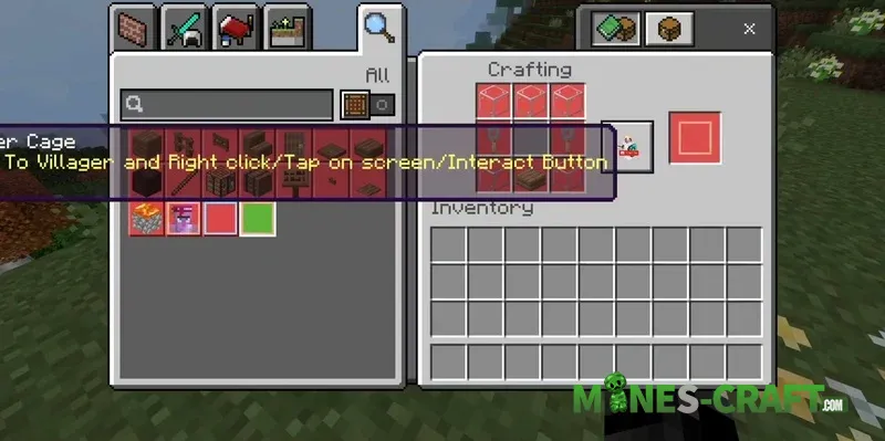 Using an empty case, you can capture any villager or iron golem. Get right up close and tap the mob to pack it into the box. The case block then functions as a full-fledged trading and crafting station. Trading takes place through the block’s interface and destroying the top part of the block releases the villager.
