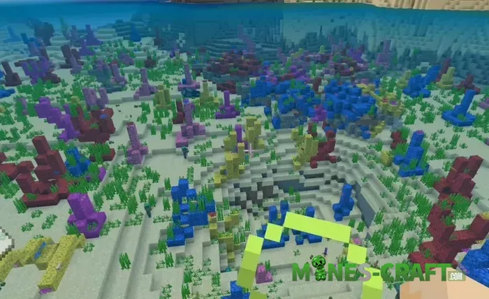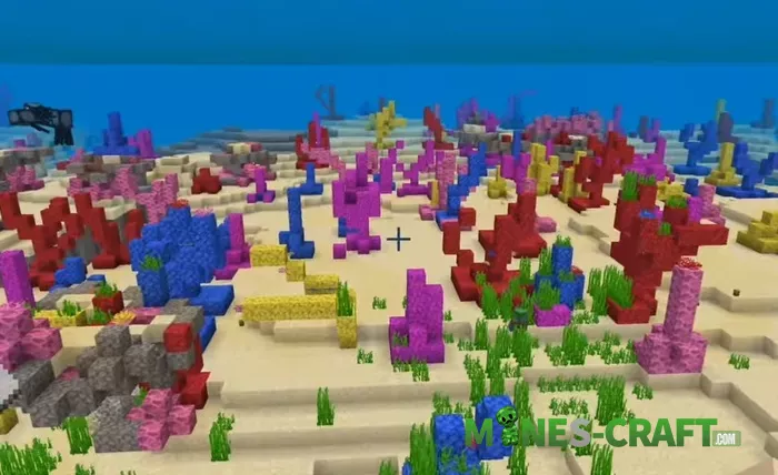 The pack removes the blue fog that fills every underwater block in Minecraft Bedrock 1.21. Coral blocks turn bright pink, yellow and magenta instead of dull gray blue. Ruins and shipwrecks stand out against the open water plus drowned show up while they are still several blocks away. Players no longer drink Night Vision potions every few minutes.