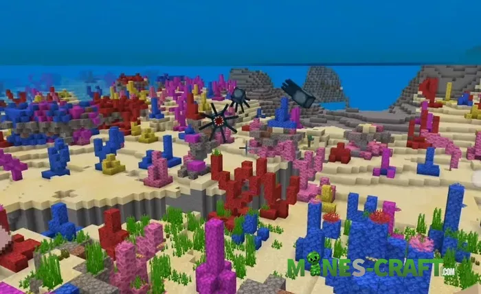 Ocean water keeps its color but loses the haze. Tube coral and brain coral keep the same textures, yet the colors look saturated instead of faded. Cod, salmon and tropical fish swim in clear view. Shipwrecks but also ocean monuments appear from a distance. The pack edits only texture files – frame rates stay the same.