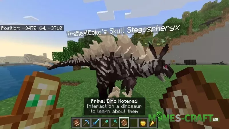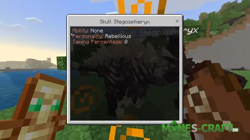 New dinosaurs can be found in the biome, including skull stego, raptors of different sizes, and other creatures with their own behaviors. Dinosaurs can be tamed, protect the player, and sometimes drop dark scales, which are used to craft items.