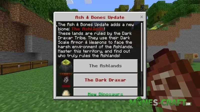 The Primal Overworld 1.2 update adds a new Ashlands biome, the Dark Drax tribe, new dinosaurs, structures, blocks, weapons and armor. These lands are home to dangerous creatures and NPCs, and the new blocks in the biome are functional and can be used in survival gameplay.