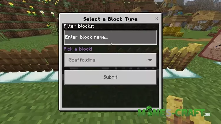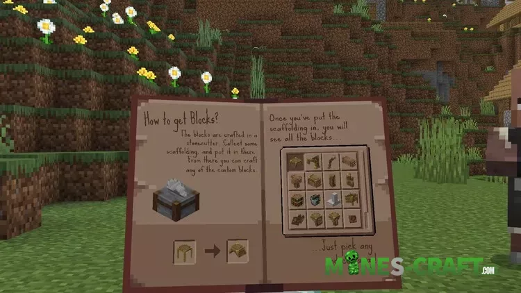 You start with a guide book and a few starter tools. Place the book to open a step-by-step manual. The pack routes everything through the stonecutter. Put scaffolding into the stonecutter and a full catalog appears. Pick frames, arches, pillars, fences, trims, and more. Many pieces have multiple shapes and textures. A picker window lets you search by block name and swap textures on the fly.