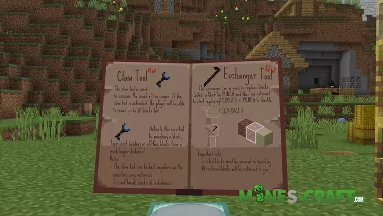 - Claw: extend your reach to 32 blocks. Place or edit from far away. Great for roofs and tall facades.