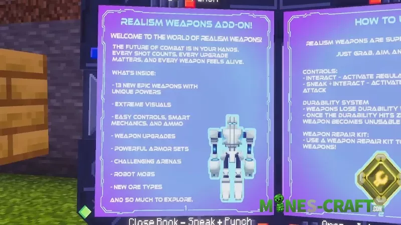 Create advanced realistic weapons, equip yourself with neon armor, fight your way through arenas, and battle new mech mobs. Improved graphics, powerful weapons, unique abilities, custom armor sets, realistic effects, robots, PvP arenas, cartoonish 3D models, and maximum realism-all for Bedrock Edition!