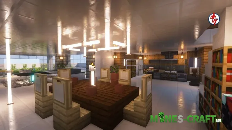 • The decor features dark oak, light stone and lots of glass, which basically makes it look more like a high-tech house for Minecraft: Bedrock.
