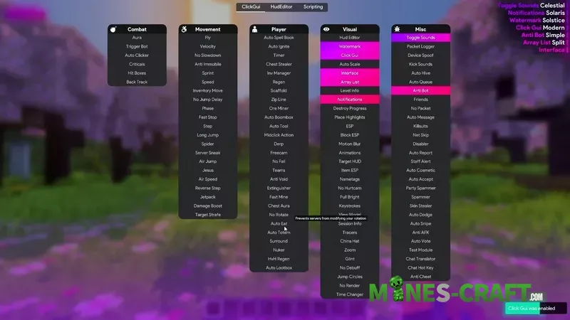 - Integration with ClickGUI for convenient control