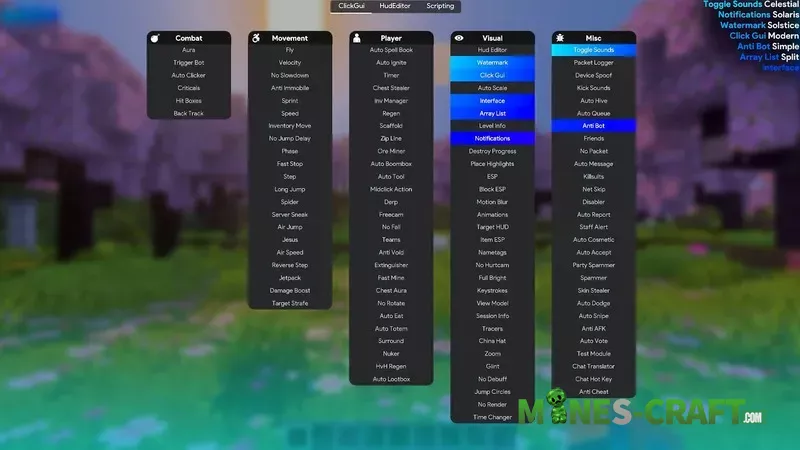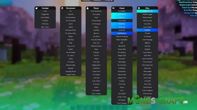 - Combat, Movement, Player, Visual, and MISK modules
