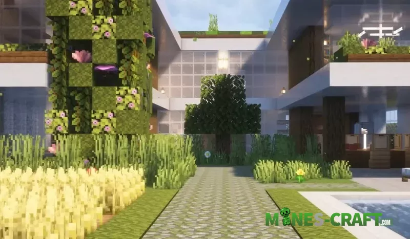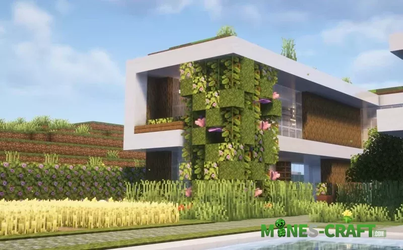 The house is built in a modern style using contrasting blocks of white concrete and dark wood. The facade is decorated with blocks of foliage with pink flowers (spore flowers) that cascade down. The roof is also planted with grass. The surrounding area is landscaped; there is a swimming pool, smooth gravel paths, a small wheat field and something like a farm.