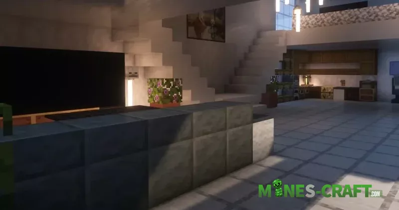 The interior is completely finished, and the space is divided into functional areas. On the first floor there is a kitchen with stoves and workbenches, as well as a living room with a large black concrete screen. Technically the house is fully lit by hidden lamps, and useful items have already been left in the chests.
