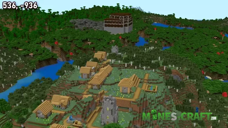 If you want a survival adventure with everything at your fingertips this seed is unbeatable. Within just 2,000 blocks of spawn you’ll find every single biome and almost every structure in the game. You start in a flower forest and peaceful plains surrounded by winding rivers.