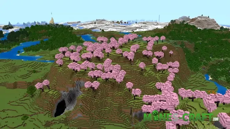 Explore further and discover a bamboo jungle with a temple, savannah valleys, dark oak islands, cherry grove hills and even snowy peaks. The best part? A Woodland Mansion only 500 blocks away from spawn – extremely rare and available in both Bedrock 1.21 and Java.
