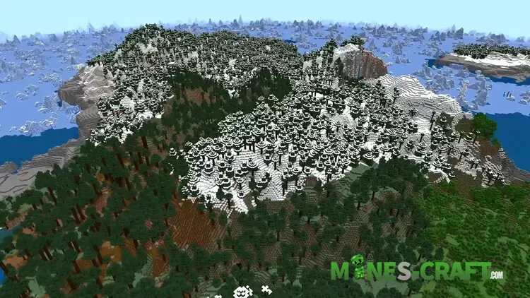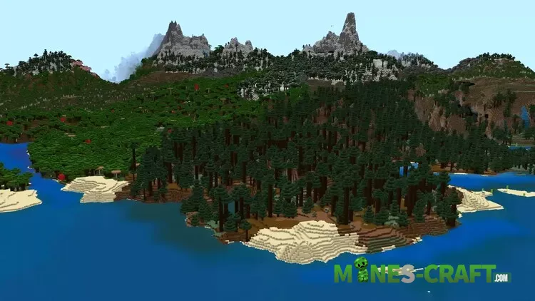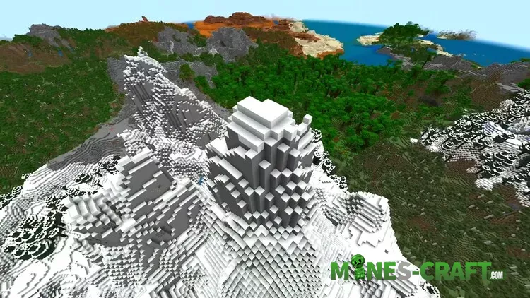 From the spawn near the ocean you’ll see mountains rising inland and can climb to their peaks for a full panorama of every biome in Minecraft.