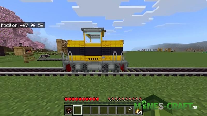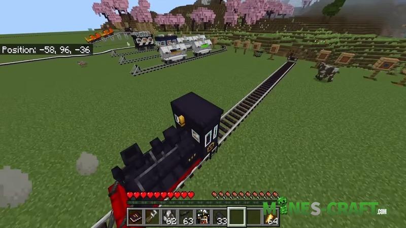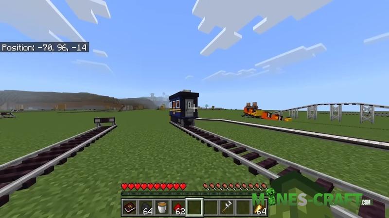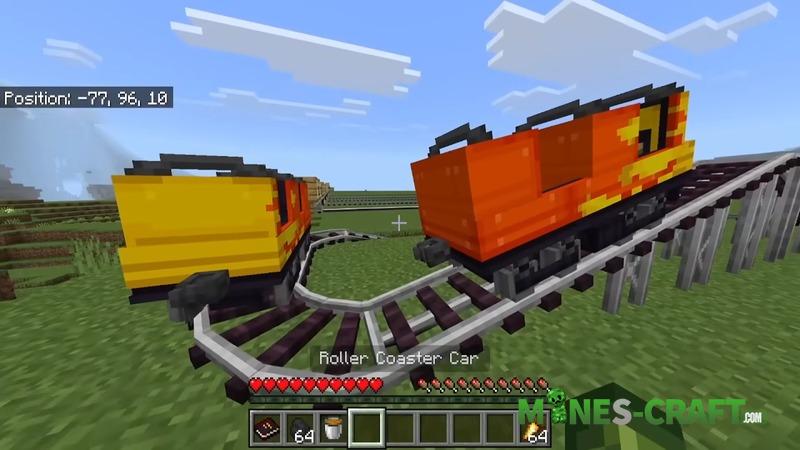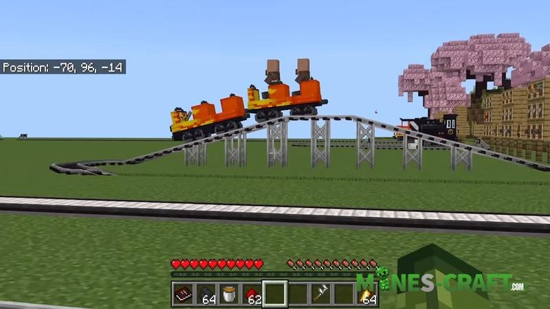 TRAINS Addon includes a modern subway system with automatic doors and the ability to change train colors. Roller coasters run on redstone, the speed can be adjusted and the coupling works even on turns, so you can ride NPCs or friends, making whole routes.