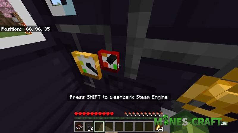 A unique drilling rig turns a locomotive into a tunnel boring module. It automatically lays rails, lights the way and replaces missing blocks. The drill has three states: new, worn and damaged. Lighting and extra blocks don’t need crafting; they just appear automatically.