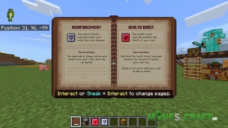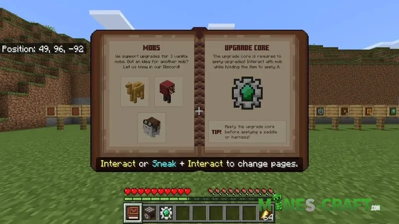 You’ll need three basic items: a manual, a traveler’s workbench, and an upgrade core. The workbench is easy to craft-six iron ingots and red dust. It contains all the necessary modules. To upgrade a mob, you must first apply the core to it, and only then attach a saddle or harness.