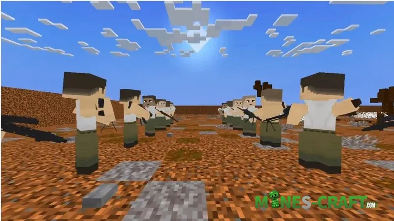 In addition to weapons, the add-on adds individual NPC soldiers that can be spawned via spawn eggs. Each mob is tied to a specific weapon and army: Allies: soldiers with BAR, M1903, Thompson, M1A1-Garand, Grease Gun (M3). Soviet: with DP-27, Mosin, PPSh, PPS, SVT-40, including snipers. German: soldiers with MP40, MG42, Kar98k, Stg44, officer with P08. Japanese: Type11, Type38, Type99, Type100, officer with Type14.